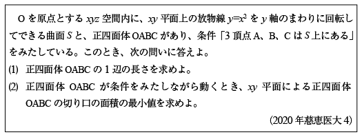 [C]回転放物面に内接する正四面体の断面積の問題(2020年慈恵医大4)