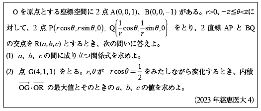 [C]空間ベクトルの交点と内積の問題(2023年慈恵医大4)