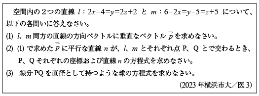 [B]空間における直線方程式とベクトルの問題(2023年横浜市大/医3)