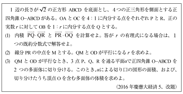 [D]正四角錘を切断した立体の体積の問題(2016年慶應大/経済5)