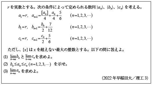 [E]ガウス記号を使った漸化式の極限の問題(2022年早稲田大/理工3)