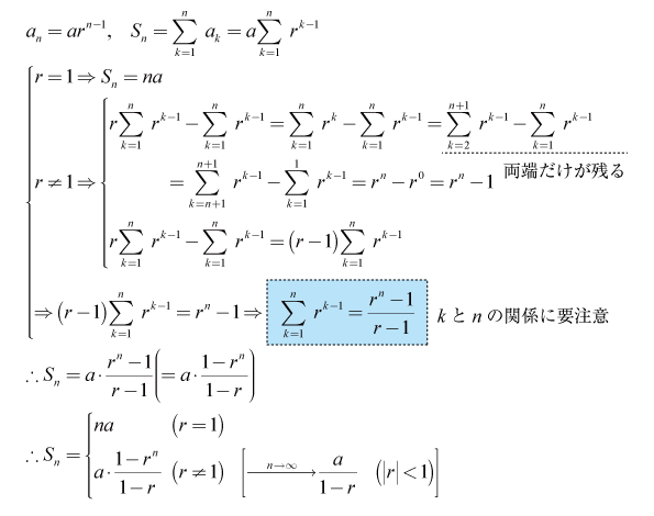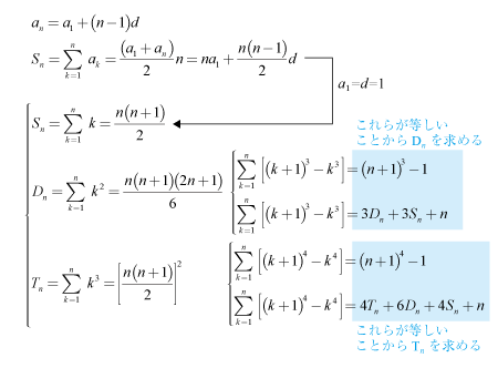 自然数のk乗の和は等差数列の和として計算できます。等差数列の次の公式はすべていつでもどこでも自分で導き出せるようにしておくことが必須です。k^2の和は3乗項の差の総和から、k^3の和は4乗項の差の総和から求めます。