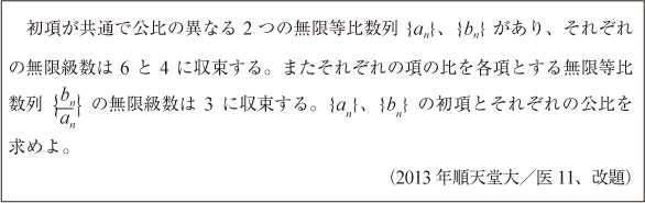 [B]無限等比数列の初項・公比の問題(2013年順天堂大/医11)