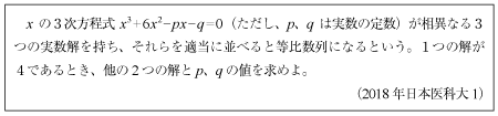 [B]解が等比数列をなす3次方程式の問題(2018年日本医科大1)