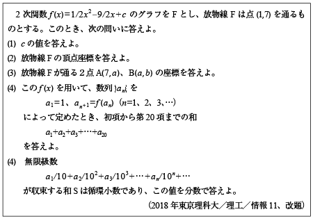 [B]2次関数と数列と循環小数を組み合わせた問題(2018年東京理科大/理工/情報11)