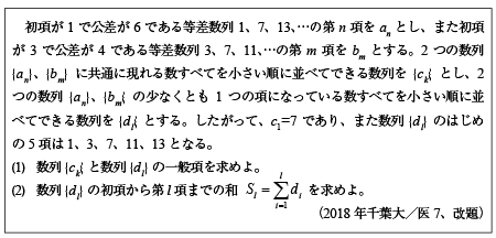 [C]2つの等差数列の和集合の総和の計算問題(2018年千葉大/医7)