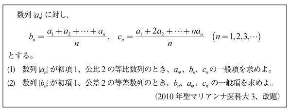 [B]等比・等差数列の平均・重み付き平均の問題(2010年聖マリアンナ医大3)