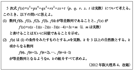 [C]5次関数の関数値が等差数列を構成する問題(2012年阪大理系4)