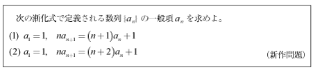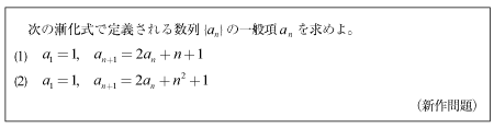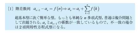 本項ではまず、パターンを取得するために、できるだけやさしい問題から紹介します。漸化式は国立大では単独ではなく確率などの融合問題として出題される場合が多く、その場合には「漸化式を作る」ところから始まります。したがってこの分野はかならず「得意分野」にしておかなければなりません。パターンは随時改善していきます。
