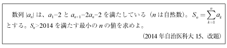 [B]2項間特性方程式型漸化式の部分和の評価の問題(2014年自治医科大15)