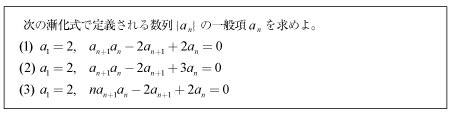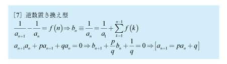 分数型漸化式は逆数型漸化式の一般化された形であり、特に面倒ですが、一般的には誘導が用意されます。初めて見たときや誘導がないときのためには、あらかじめ慣れておくべきでしょう。分数型漸化式の一般的な解法はこちらに紹介しておきます。