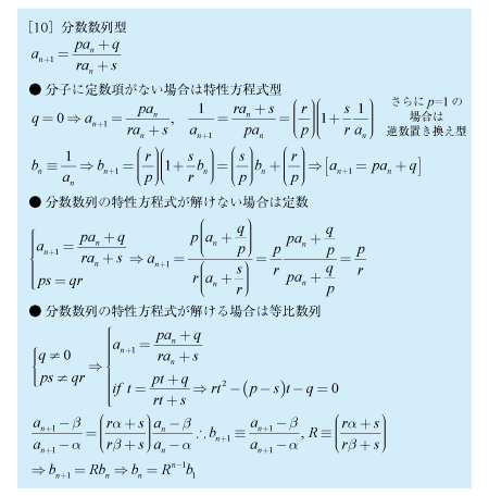 漸化式には、明らかな等差数列・等比数列と特殊な連立漸化式・数学的帰納法などのパターンを除くと、主要なパターンは下記の10種にまとめられます。