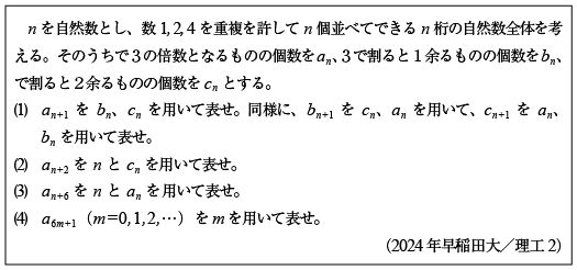 [B]剰余類に関する3つ組の数列の問題(2024年早稲田大/理工2)