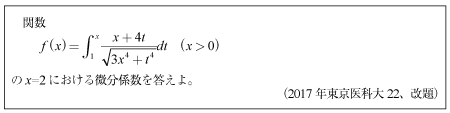 [B]積分で表した関数の微分係数を求める問題(2017年東京医科大22)