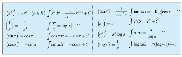 数Ⅱの微積分は多項式の微積分なので簡単です。数Ⅲでも微分は簡単です。公式通りの操作をするだけです。積分は「公式」「部分積分」「置換積分」の組合せです。主な公式を下に示します。主な公式の証明は、クリックすると別の