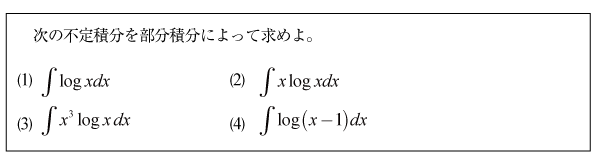 部分積分が1回で済むとは限りません。指数関数×三角関数の積分でも2回必要でした。3回必要な場合もあります。三角関数に2乗以上のべき乗がかかっている場合や、対数のべき乗の場合は2回以上の部分積分が必要になります。xのべき乗×対数関数の積分は、べき乗が何乗になろうと部分積分は1回だけで済みます。