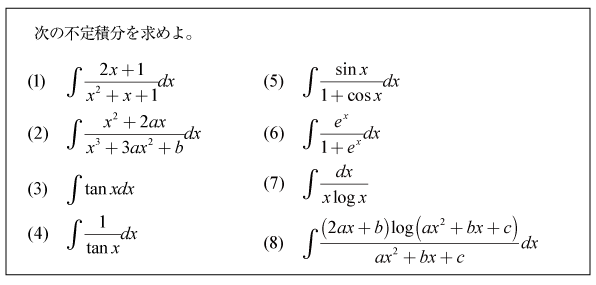 関数の積の微分と部分積分は裏表の関係にあります。べき乗と三角関数・指数関数・対数関数の組合せの積分や、三角関数と指数関数の積など「異種関数の積」の積分には部分積分を利用します。三角関数の積分をご参照ください。