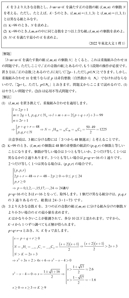 [B]奇数群を3つに組分けする場合の数の問題(2022年東北大文1理1)