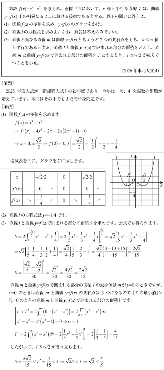 [B]4次関数と水平接線が囲む領域の面積の問題