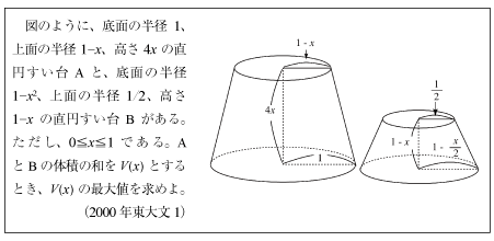 [B]直円錐台の体積の和の最大値を求めるやさしい問題(2000年東大文1理1)
