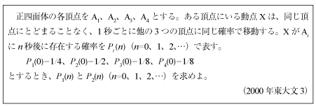 [B]正四面体の頂点を移動する確率漸化式の問題(2000年東大文科3)