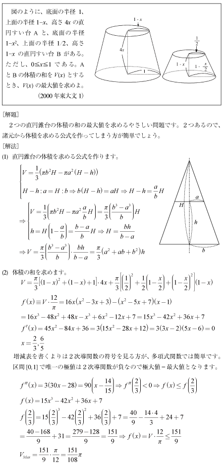 [B]直円錐台の体積の和の最大値を求めるやさしい問題(2000年東大文1理1)
