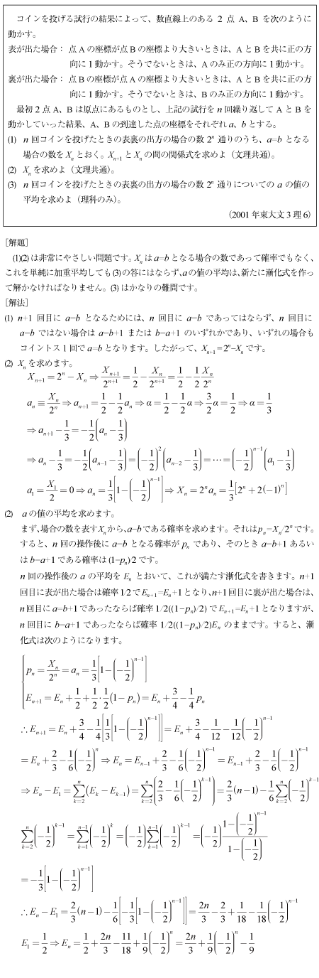 [C]数直線上の移動の確率に関する漸化式の問題(2001年東大文3理6)