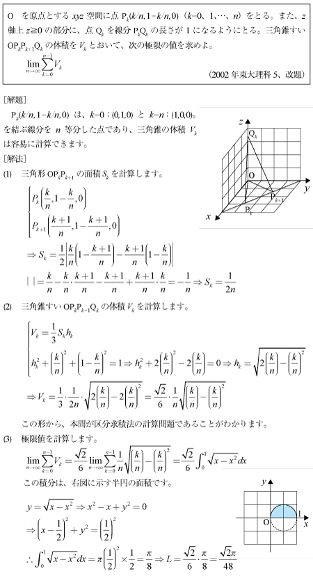 [B]三角錐の体積の無限和を区分求積法で求める問題(2002年東大理科5)