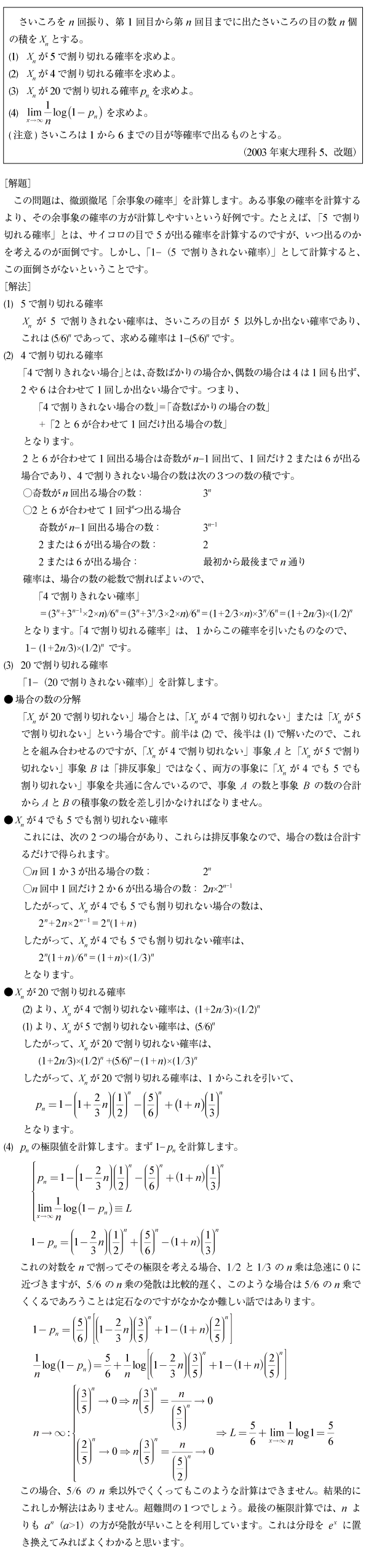 [D]さいころの目の積の割り算の確率と極限値の問題(2003年東大理科5)