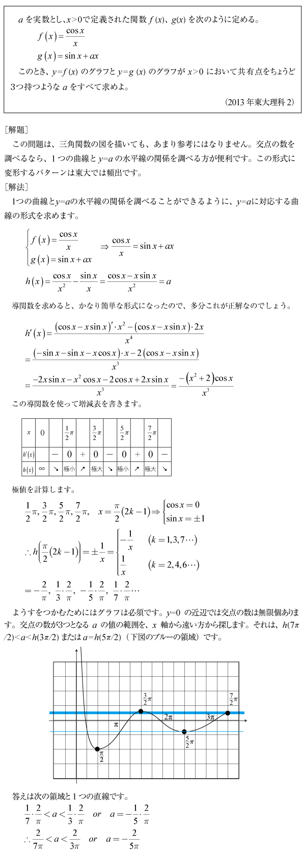 [C]三角関数・分数関数の解の個数の問題(2013年東大理系2)
