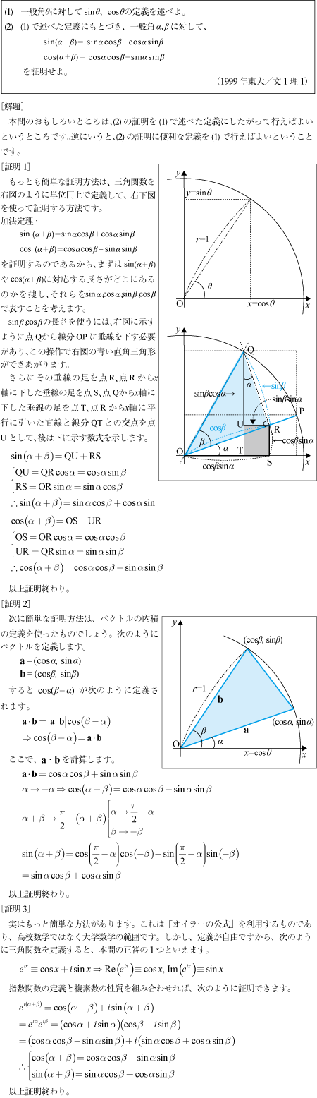 [A]三角関数の加法定理の証明(1999年東大文1理1)