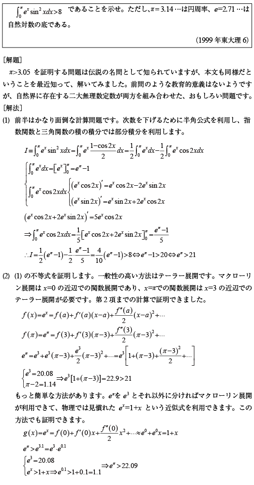 [B]積分結果に関する不等式の伝説の問題(1999年東大理6)