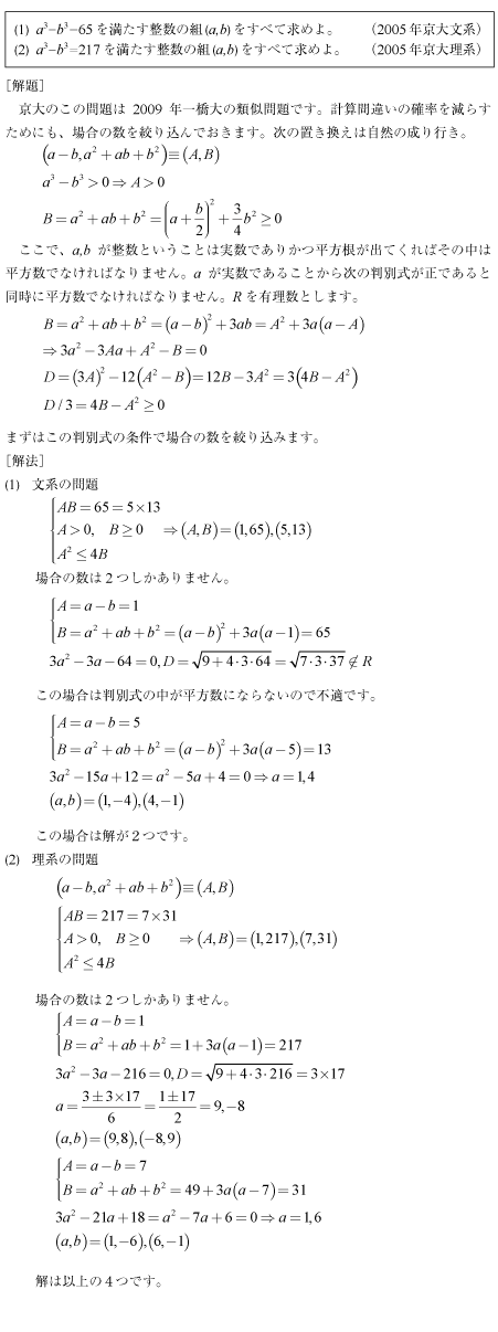 [C]整数の3乗差の整数問題(2005年京大文4理4)