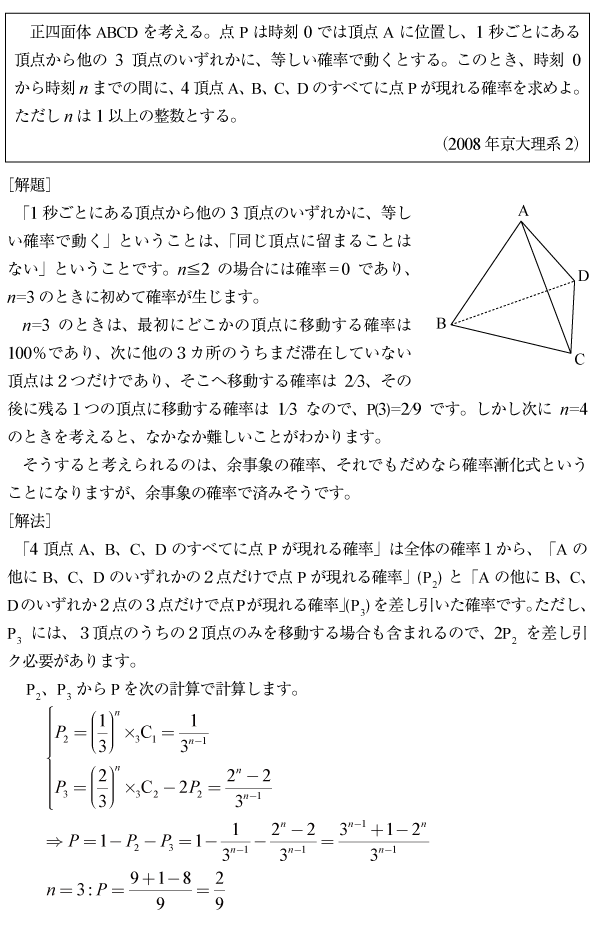[B]正四面体上の移動の確率の問題(2008年京大理系2)