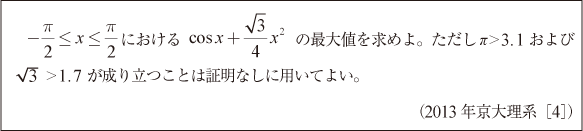 [C]導関数=0の解不明で最大値を求める問題(2013年京大理系4)