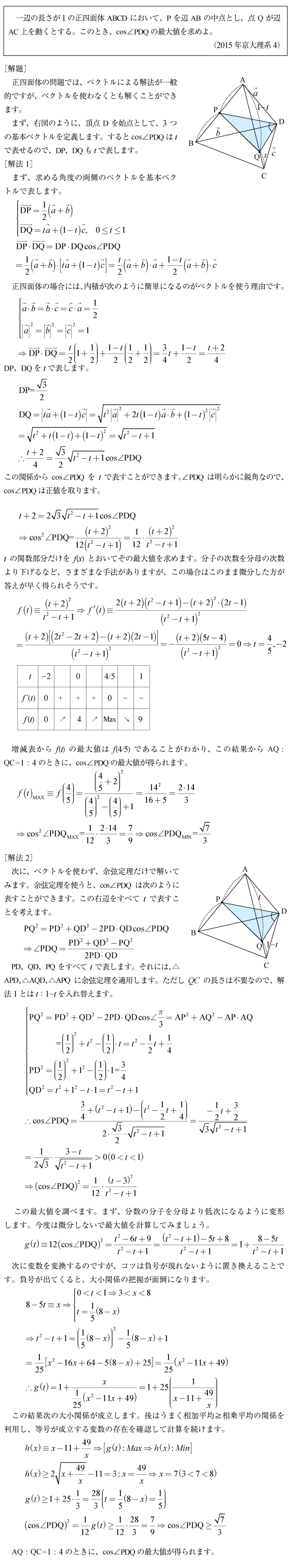 [C]正四面体内のベクトルのなす角度の問題(2015年京大理系4)