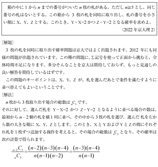 [C]n枚の札から3枚を引いて差が2ずつの確率問題