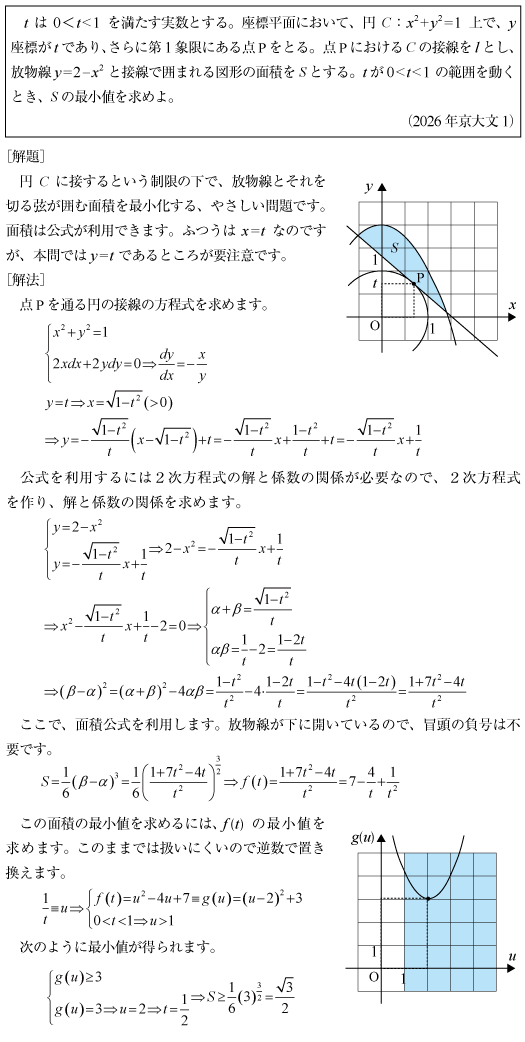 [B]放物線の弓型領域の面積問題(2026年京大文1)