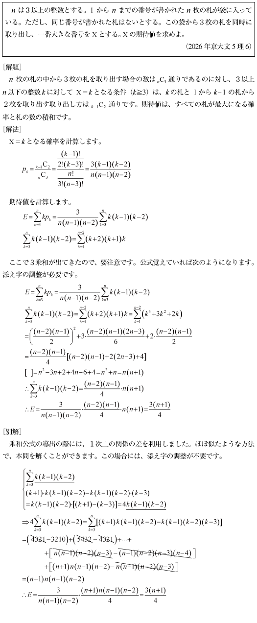 [B]袋から取り出した3枚の札の最大の番号の期待値の問題