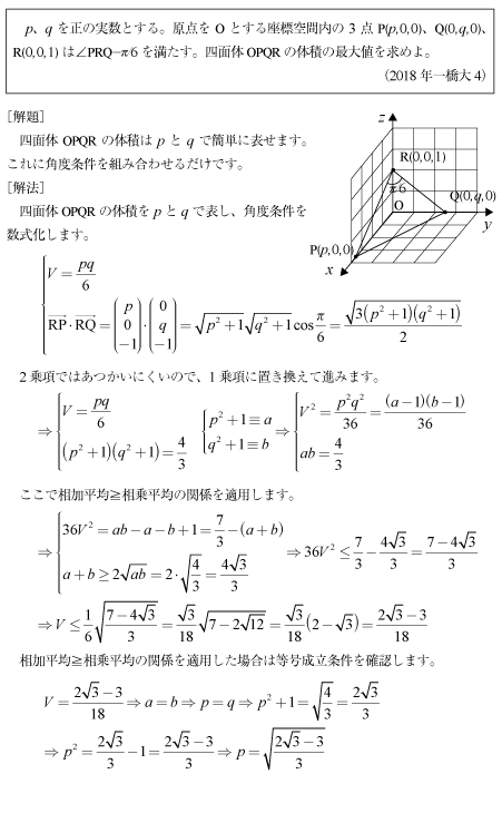 [B]相加平均≧相乗平均によって体積の最大値を求める問題(2018年一橋大4)
