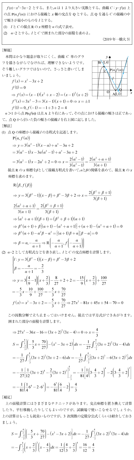 [C]3次関数と接線が囲む面積の問題(2019年一橋大3)