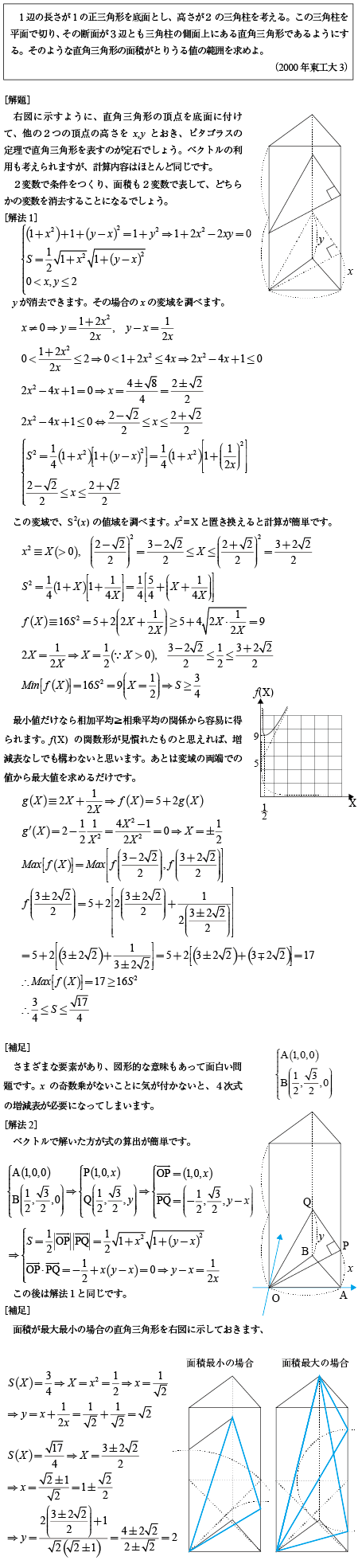 [C]正三角柱の内部の直角三角形の面積の問題(2000年東工大3)