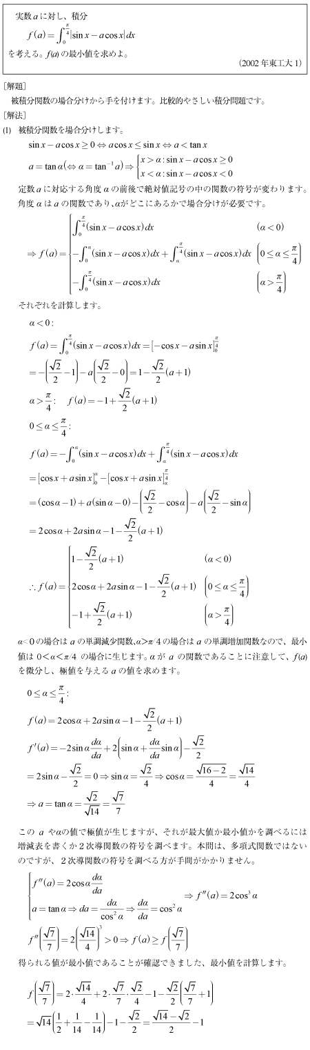 [B]絶対値記号付き三角関数の最小値を求める問題(2002年東工大1)
