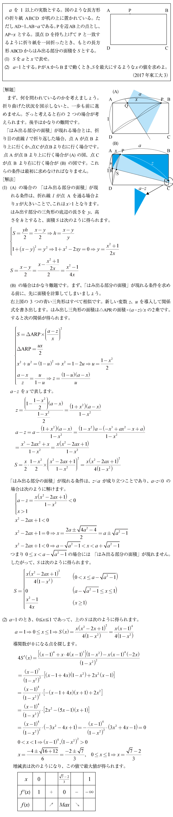 [C]長方形を折り曲げてあふれた面積の問題(2017年東工大3)