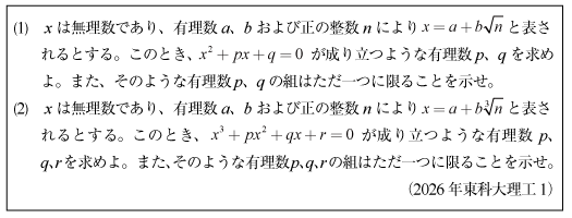第1問[C]2次・3次の有理数係数有理数方程式の問題(2026年東科大理工1)第2問[C]ホッケースティック恒等式と格子点の係数の問題(2026年東科大理工2)第3問[B]図形と方程式と平面ベクトルのハイブリッド問題(2026年東科大理工3)第4問[D]オイラー形式複素数の数列の問題(2026年東科大理工4)第5問[C]n→∞の極限で残る項の評価の問題(2026年東科大理工5)