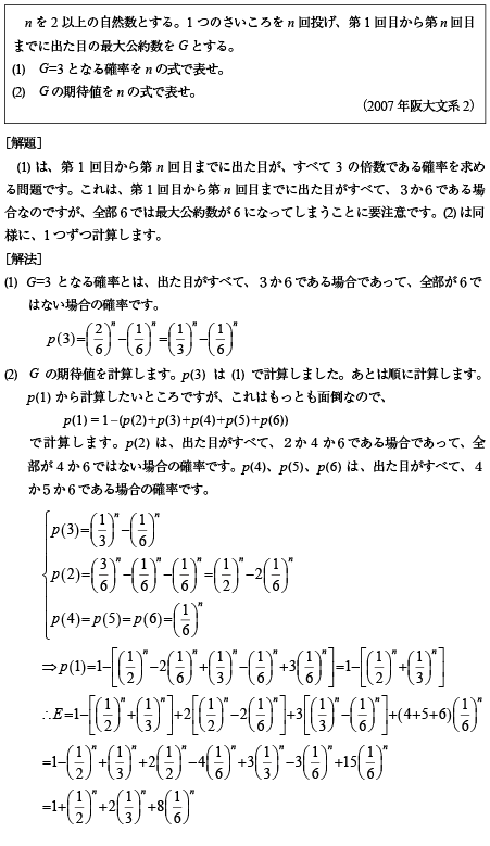 [B]さいころをn回投げた出目の最大公約数の期待値の問題
