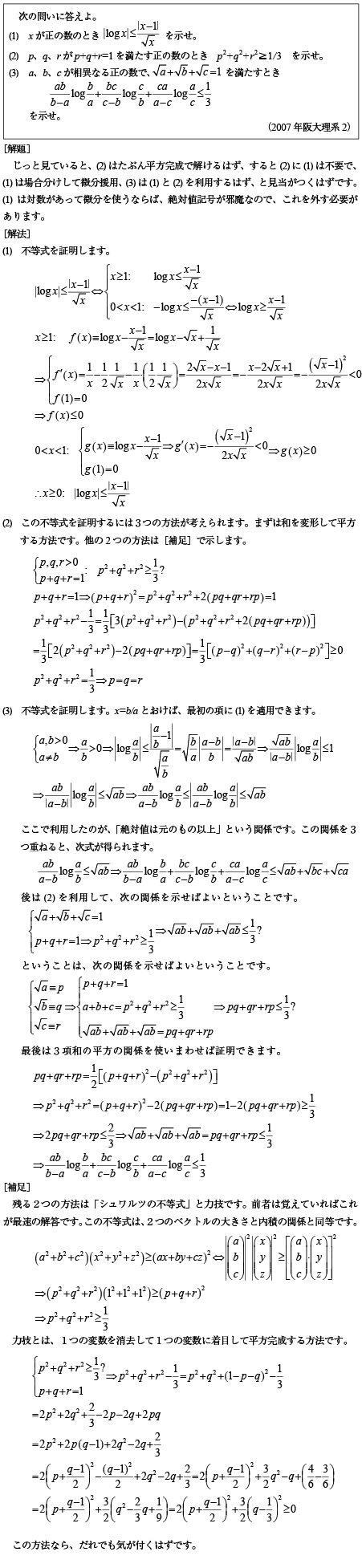 [C]微分も利用する不等式の証明問題(2007年阪大理系2)