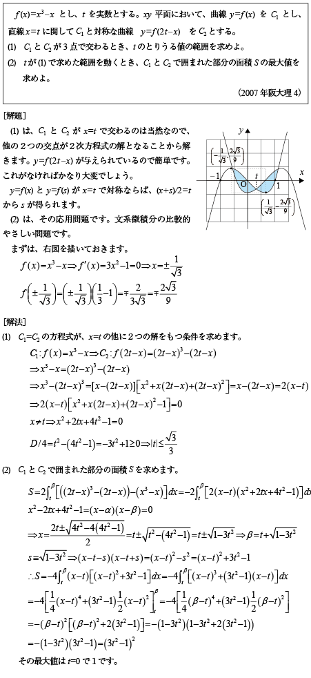 [B]線対称な2つの3次関数が囲む面積の問題(2007年阪大理系4)