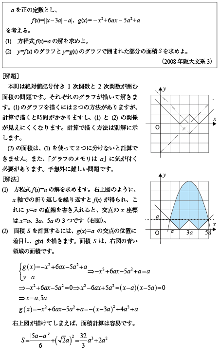 [B]絶対値記号付き1次関数と2次関数が囲む面積の問題(2008年阪大文系3)