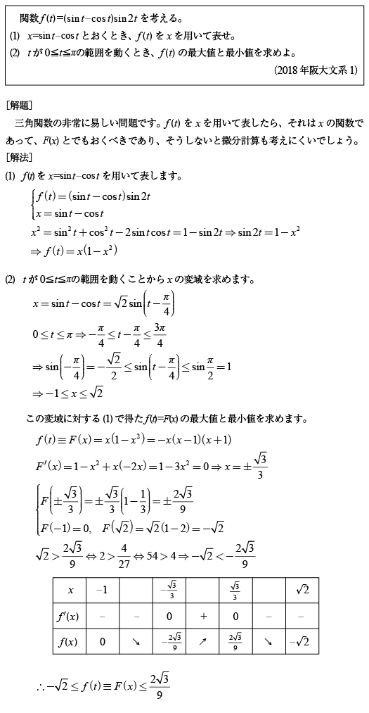 [B]三角関数の合成と3次関数の値域の問題(2018年阪大文系1)